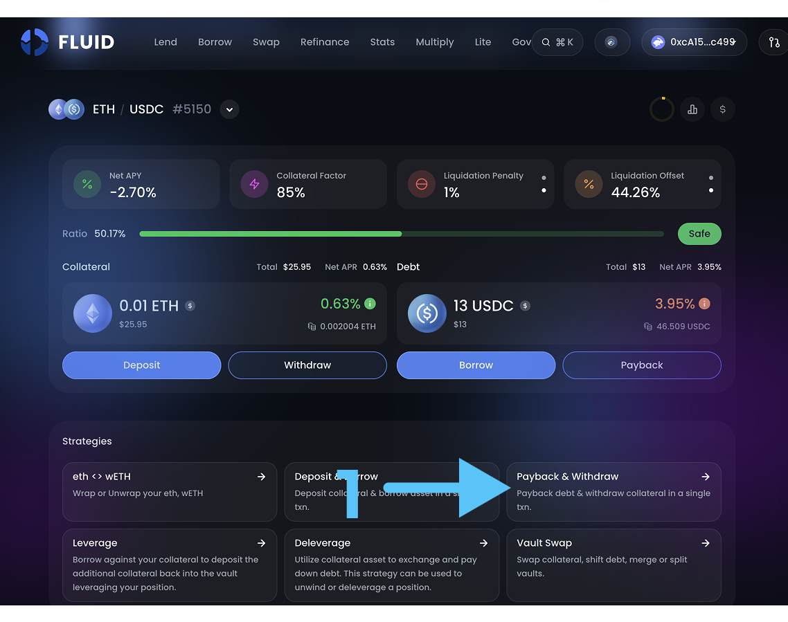 - Кликаем на “Payback & Withdraw“ (1), чтобы за раз возвратить займ и вывести залог